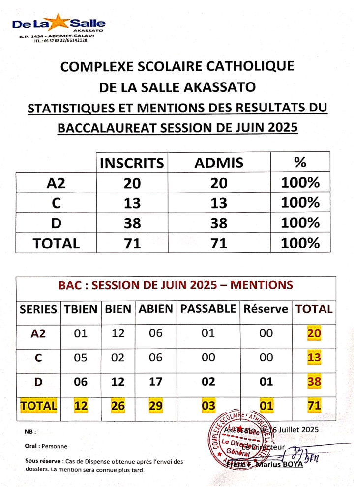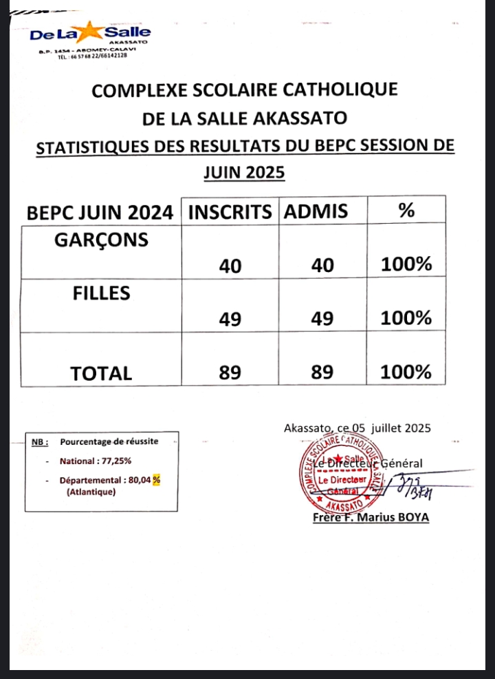 Le Complexe Scolaire Catholique de La Salle d’Akassato signe une fois de plus un parcours sans faute aux examens nationaux avec 100% de taux de réussite à tous les examens toutes séries confondues
