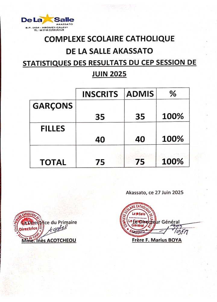 Fidèle à sa réputation d’excellence, le Complexe Scolaire Catholique de La Salle d’Akassato a une nouvelle fois brillé aux examens nationaux, affichant un taux de réussite de 100% au CEP, au BEPC et au BAC, toutes séries confondues.